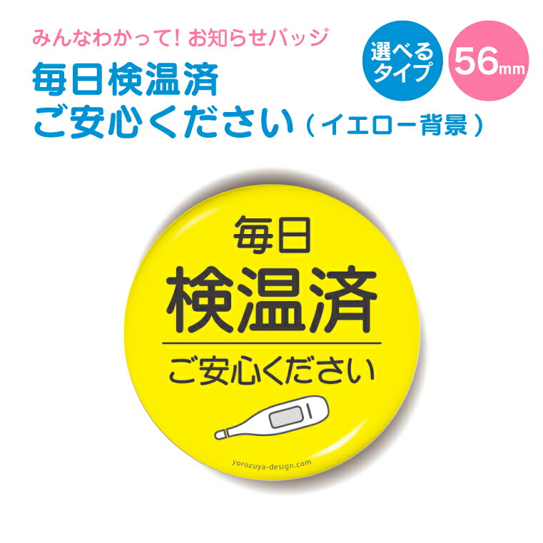 楽天市場 1000円以上で送料無料 お知らせ 缶バッジ Or キーホルダー Or マグネット 丸型56mm 毎日 検温済 ご安心ください イエロー背景 缶バッヂ キーホルダー マグネット お知らせアピールシリーズ 黄 父の日 母の日 七五三 節句 入園 入学 卒業 卒団